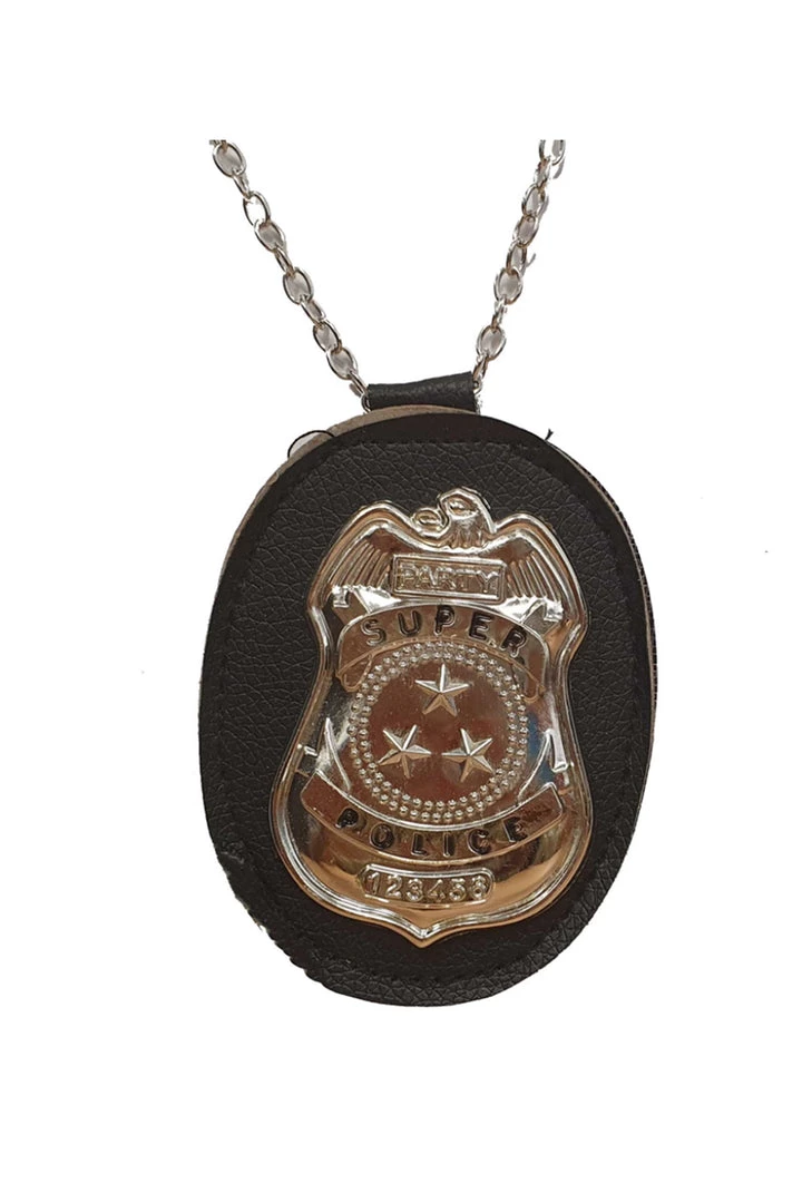 This Police Badge has a plastic metallic silver ‘Super Police’ Badge placed on an oval pleather tag, attached to a metal chain necklace.
