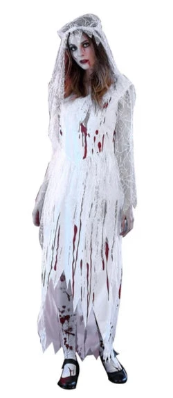 White bloodied dress with sheer spiderweb veil