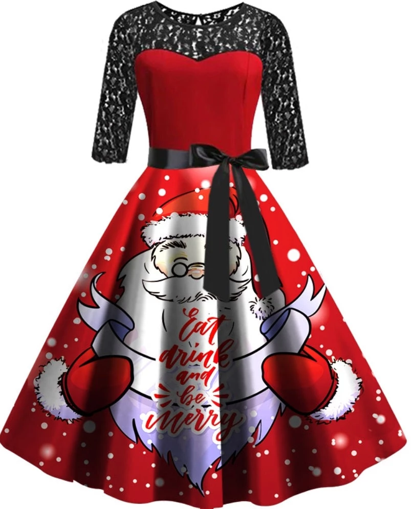This Beautiful Dress would be perfect for Christmas Day! Dress has Lace Sleeves and Top. Red Bust with a satin bow at the waist. Full Circle Skirt with Santa Claus ‘Eat, Drink and Be Merry’ Print. S – 2XL.