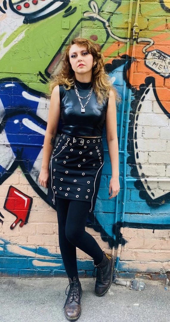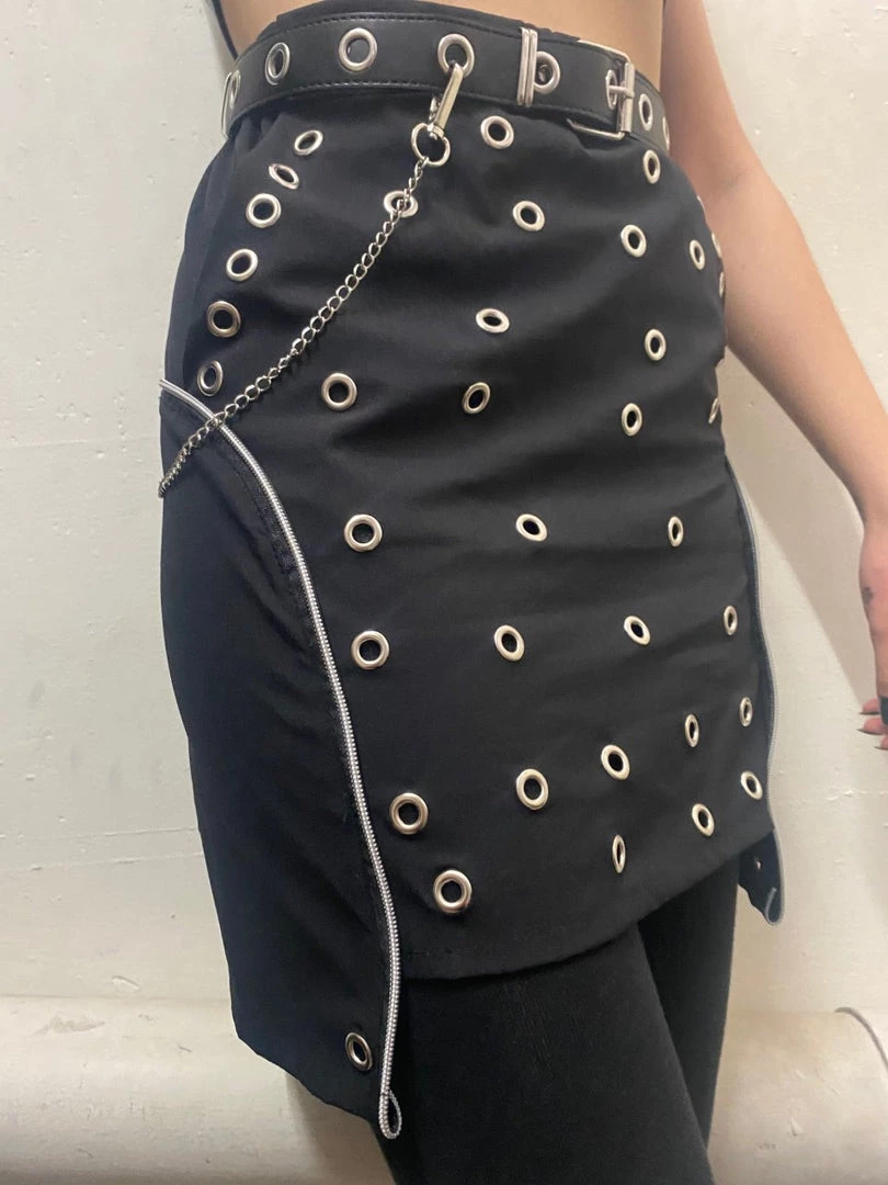 This Irregular skirt has eyelet detail all over the front. High-Waisted black skirt with two longer patches on the sides attached by Zippers. Fabulous skirt to stand out from the crowd!