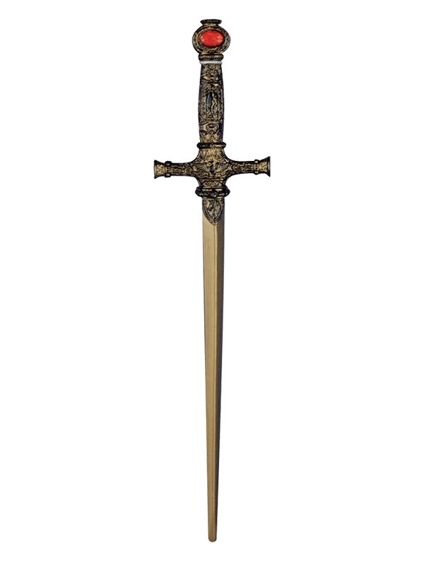 lightweight plastic wizard sword with a ruby set into the pommel. Ornate hilt. bronze style finish.