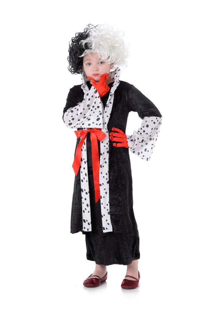 Includes black coat with Dalmatian print trim, red satin waist tie, wig and gloves.