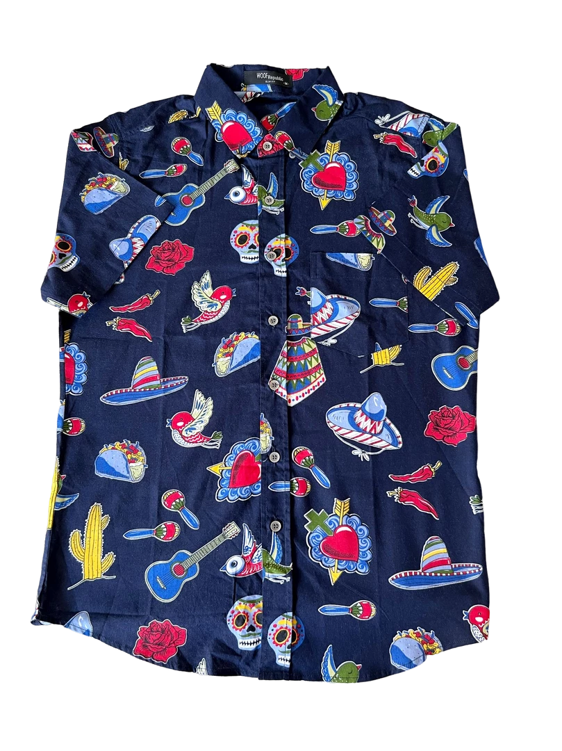 Navy button-up men’s party shirt with Fiesta Mexican design.