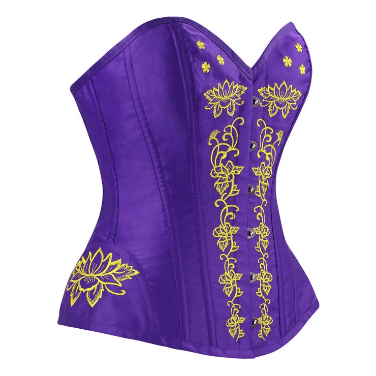 This beautiful purpke overbust corset has stunning mustard floral embroidery featured on the front and on the hips. It has a classic busk closure on the front and a lace-up back closure.
