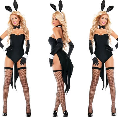 Comes with strapless romper with dramatic tuxedo tails, white cuffs and collar with bowtie, elbow length black gloves, and bunny ears and tail.