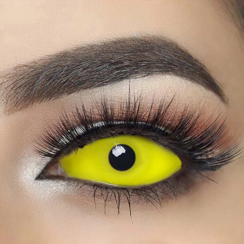 Inspired by “Mystique” And “Avatar”. Yellow 22mm sclera contact lenses which entirely cover the sclera and iris making the whole eye appear yellow!